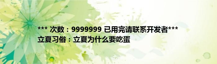 本文*** 次数:9999999 已用完请联系开发者*** 立夏习俗:立夏为什么要吃蛋到此分享完毕,希望对大家有所帮助。