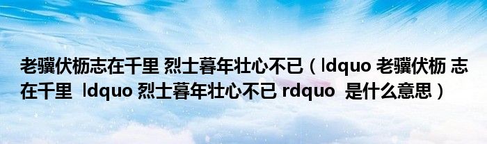 关于老骥伏枥志在千里 烈士暮年壮心不已,ldquo 老骥伏枥 志在千里 ldquo 烈士暮年壮心不已 rdquo 是什么意思这个很多人还不知道,今天菲菲来为大家解答以上的问题,现在让我们一起来看看吧!