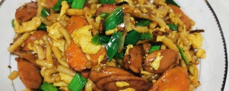 5、胡萝卜和火腿肠差不多熟的时候,将煮过的土豆粉下锅一起翻炒。