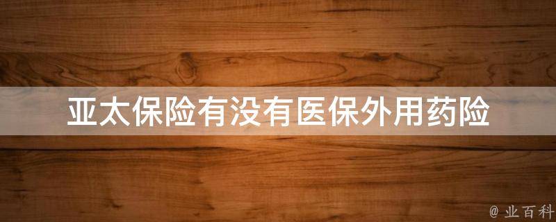 亚太保险有医保外用药险。需要注意的是,这种保险通常是作为附加险种而存在的,也就是说,需要在购买了其他主险的基础上才能购买医保外用药险。具体的购买方式可以联系保险公司或者代理人进行咨询。