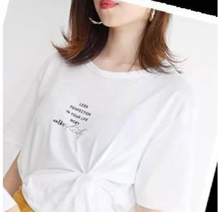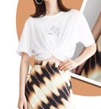6、胸前打结:在胸前喜欢的位置将T恤向里卷,然后用皮筋将其固定。整理好外侧的褶皱。