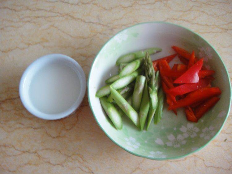 2、芦笋洗净切断,彩椒洗净切片,生粉加入清水融化待用。