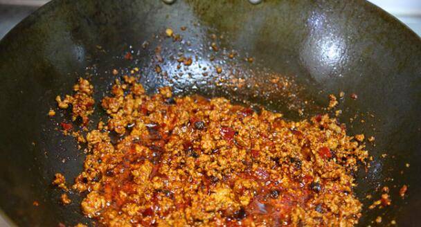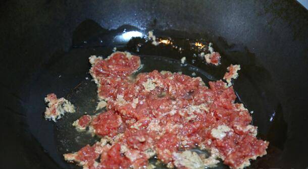 4、锅中倒油,油热后将牛肉末放入锅中煸炒至颜色变白。
