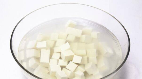 2、将豆腐放入淡盐水中浸泡15分钟左右,用盐水浸泡,可以防止豆腐在翻炒时易碎。