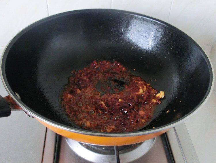 7、炒锅烧热,放油,放入葱、姜、豆瓣酱炒出红油。