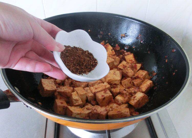 10、出锅时,放入花椒粉翻炒均匀,最后淋香油出锅。