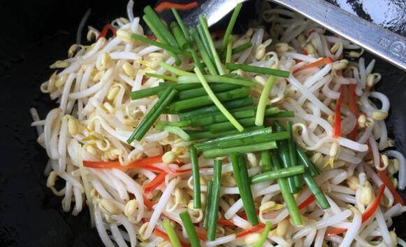 用料:绿豆芽200克、油适量、盐1克、红椒1个、香葱3根、姜丝3克、干花椒。
