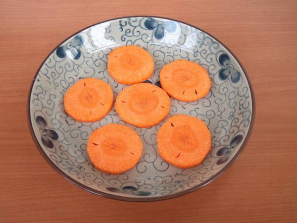 2、将胡萝卜切成稍微厚些的片放在盘子上。