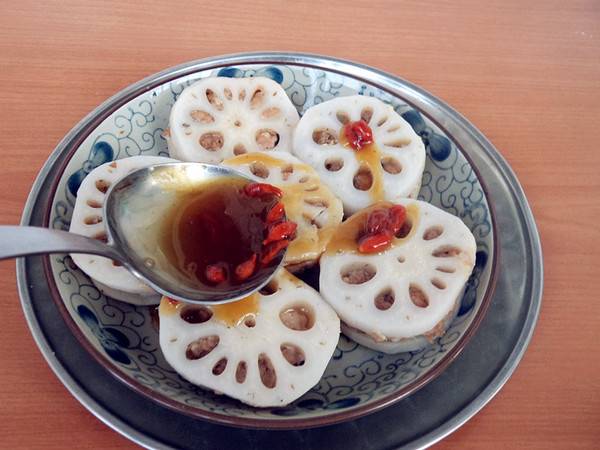 9、将料汁浇在藕夹上即可。