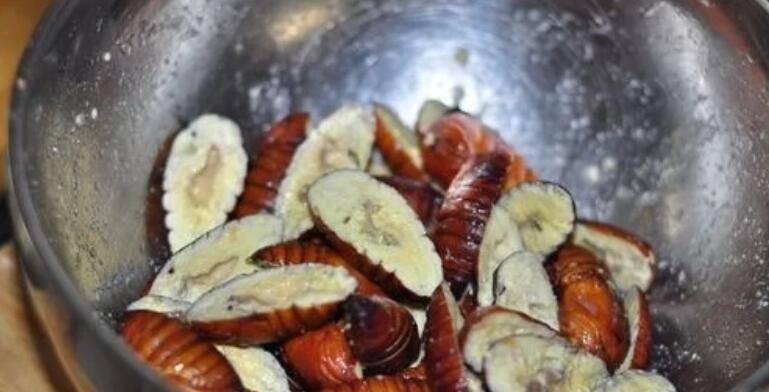 6、起锅倒油,油温八成热时下入蚕蛹滑油片刻后捞出控油。