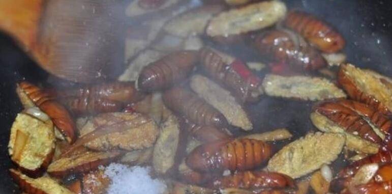 8、下入蚕蛹炒匀。倒入酱油,糖,盐炒匀。