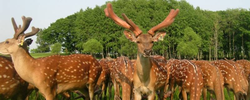 敖东梅花鹿:体型中等,体质结实;体躯圆粗,胸宽而深,腹围较大,背腰平直,臀丰满,无肩峰,四肢较短;头方正,额宽平,耳大小适中,目光温和,眼大无眼圈,颈较粗,尾中等长;角基距较宽,角基围中等,角柄低而向外侧斜。