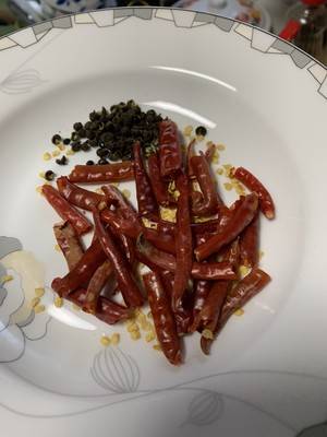 2、干辣椒、花椒粒备好。