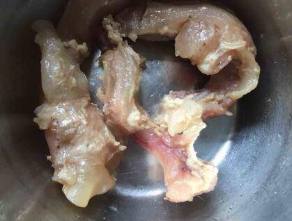 牛蹄筋洗净后倒入电饭煲内胆中,继续放入生姜片、香叶、八角、桂皮、2勺料酒。
