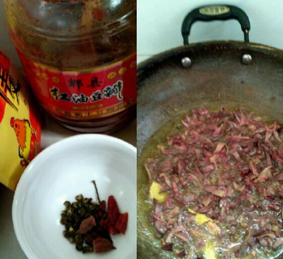 2、锅里放油烧热,放花椒、八角、干辣椒段,然后放郡肝爆炒,放点料酒去腥,把水分炒干。