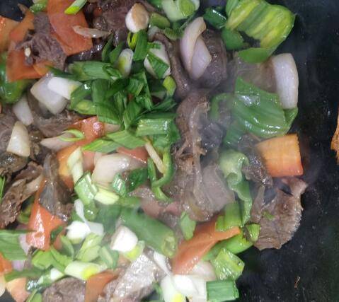 放入酱牛肉和大蒜一起翻炒,期间加蚝油、生抽,最后放适量盐调味即可出锅。