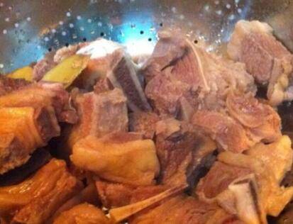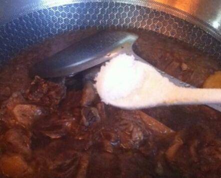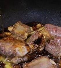 5、压好的牛肋排连汤水一起倒回炒锅里,煮开后加点生抽,加点老抽,加点冰糖,加点盐调味,等汁水收干时淋上香油即可。