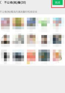 6、在不让他看界面,点击右上角“完成”。经过上述步骤操作后,列表中添加的所有人就不可以查看该帐号的朋友圈及视频动态。