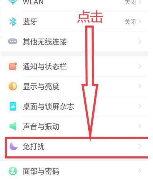 2、在“设置”下拉选项中,查找点击“免打扰”选项。