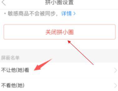 5、进入“屏蔽名单”中的“不让他看”,将自己的好友进行屏蔽即可。或者关闭拼小圈。