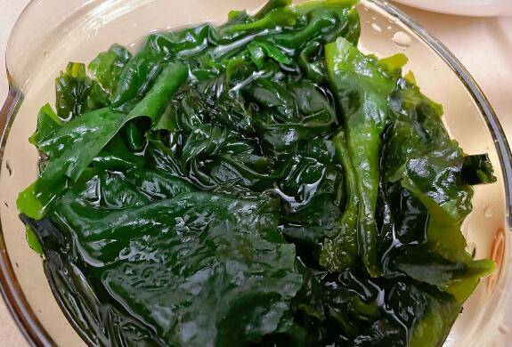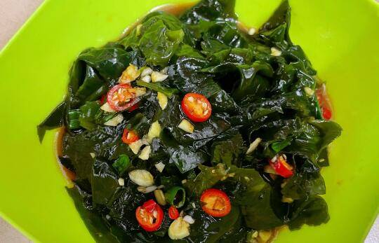 用料:干裙带菜50克、生抽一汤匙、陈醋一汤匙、蚝油一勺、白糖一勺、小米椒三个、花生油一勺、蒜2瓣、葱1根、盐10克。