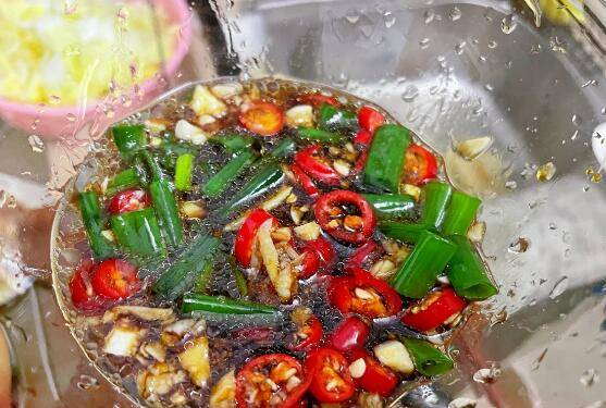 4、调酱料,放入切好的蒜、小米椒、葱段,加入一勺油、一勺酱油、一勺蚝油、一勺陈醋、一勺白糖、半勺盐,搅拌均匀。
