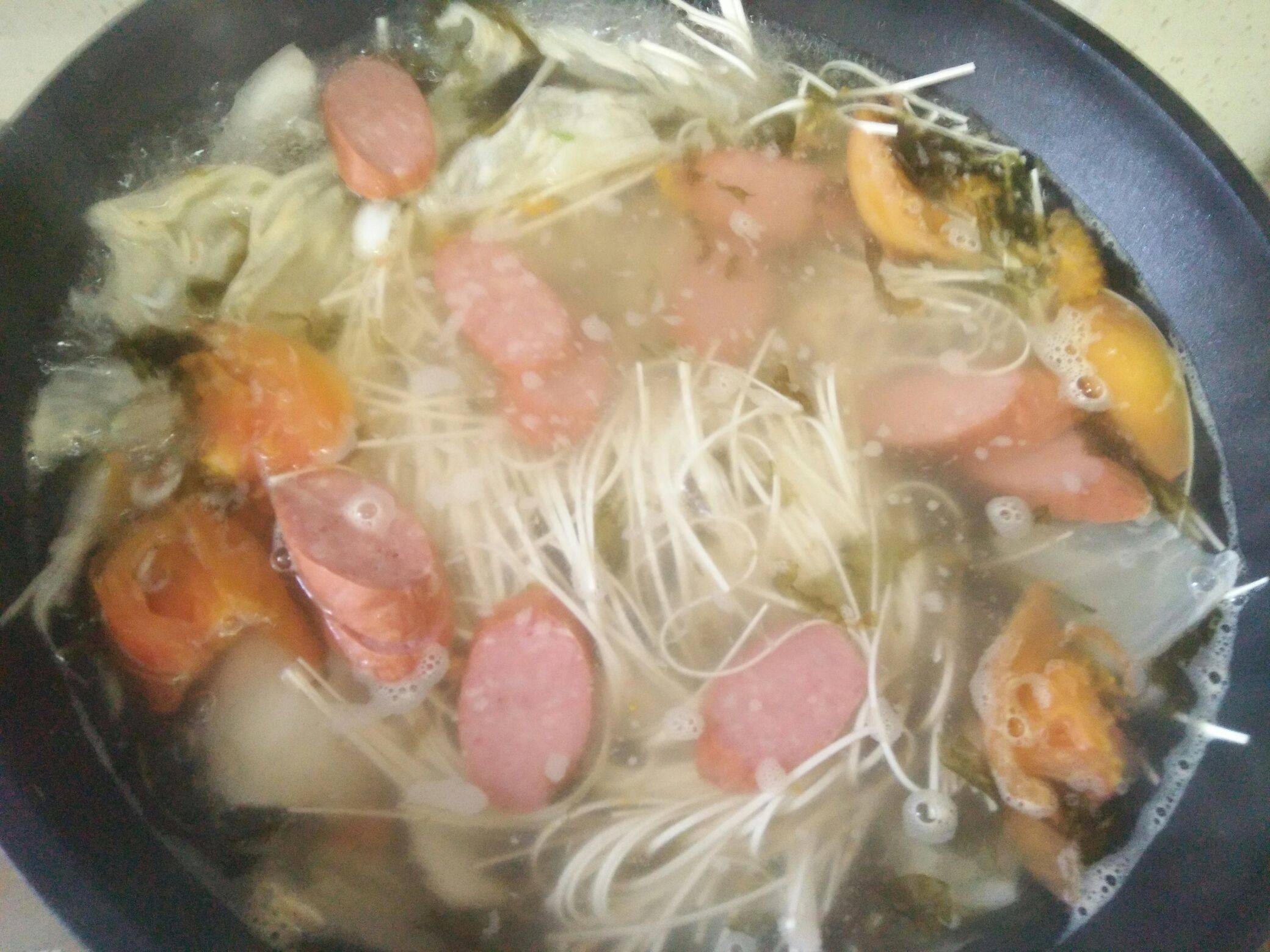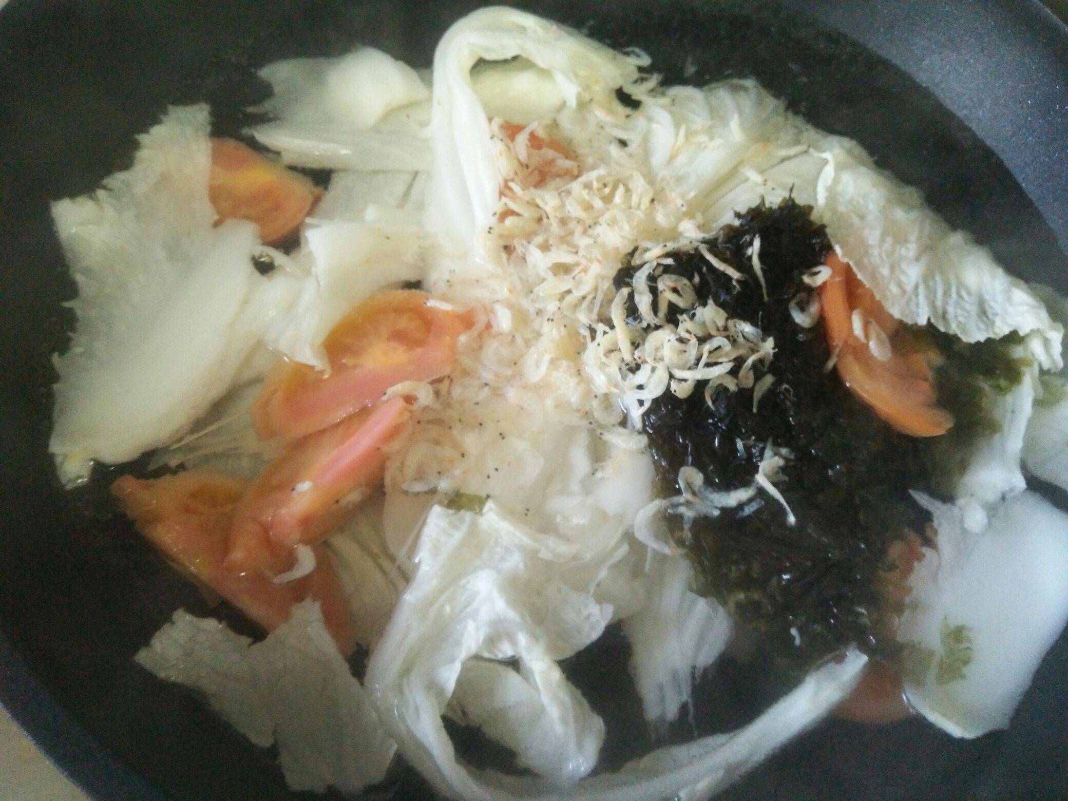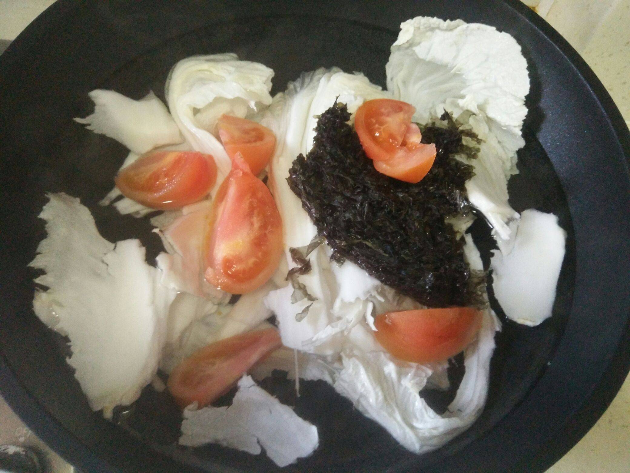 1、准备材料:挂面适量、白菜适量、西红柿一个、紫菜适量、虾皮适量、香肠半根、盐适量、鸡精适量、葱花适量、香菜适量。