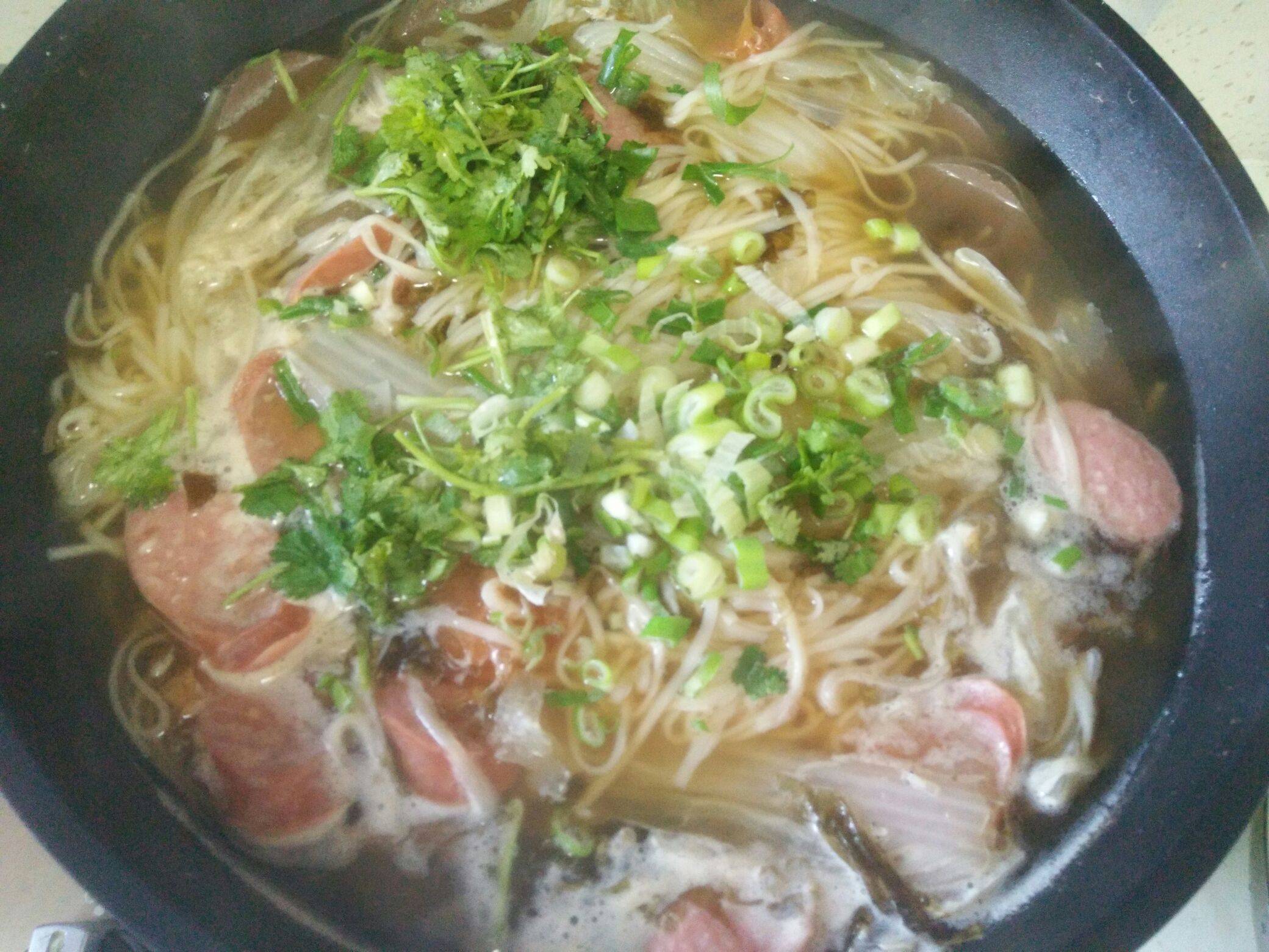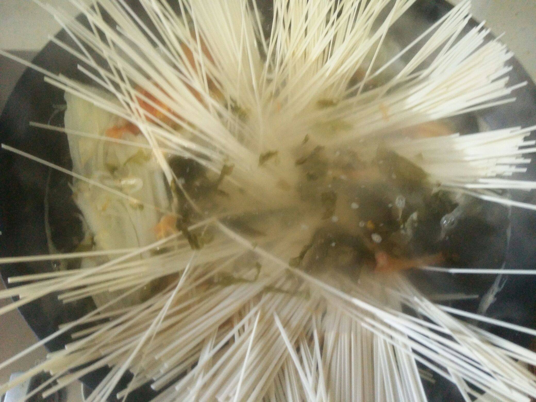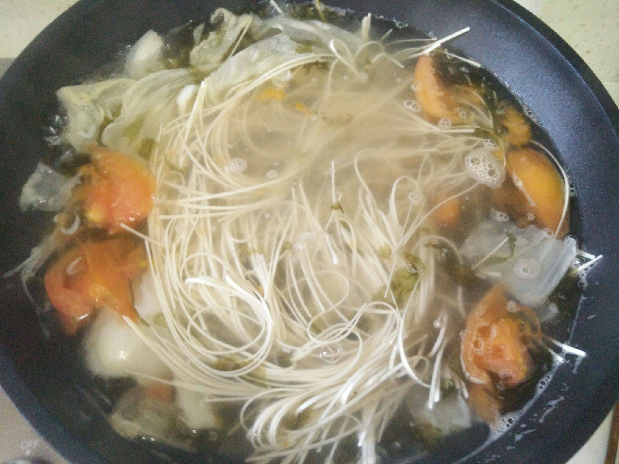 1、准备材料:挂面适量、白菜适量、西红柿一个、紫菜适量、虾皮适量、香肠半根、盐适量、鸡精适量、葱花适量、香菜适量。