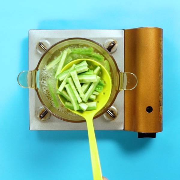 1、苦瓜去瓤切条,胡萝卜去皮切条。