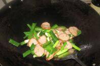 将蒜苗和灌肠炒匀,等蒜苗炒至断青,沿锅边溜点清水,加一点盐、生抽调味即可。