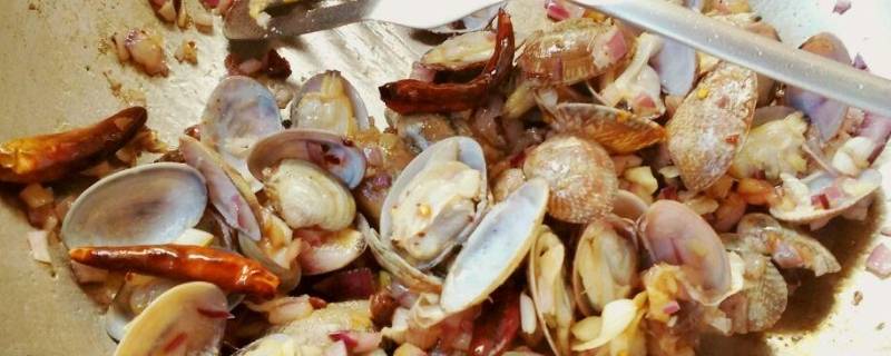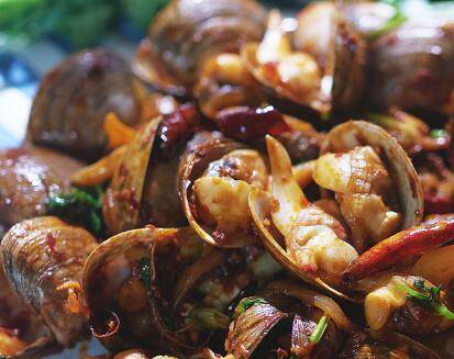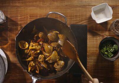 倒入黄蚬子,加入蚝油、料酒、生抽、白糖、及视情况加盐或不加盐翻炒几分钟。