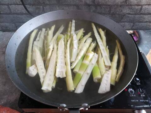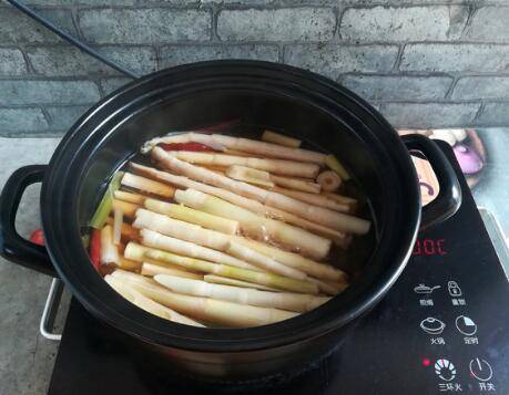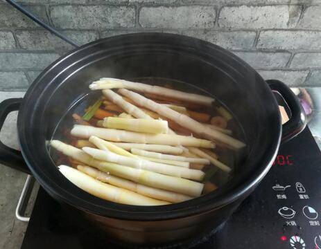 砂锅里的调味汁大火烧开后,放入焯过水的小竹笋,中火煮20分钟。