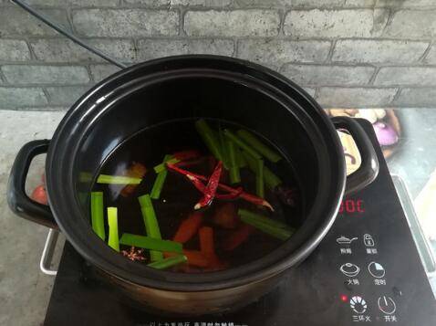 砂锅放入干辣椒 、八角 、香草、盐 、生抽、和冰糖,加适量的水。