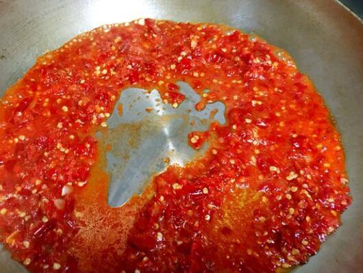剁椒加蒜粒用油炒出香味,剁椒下锅即可关火,用余温炒香剁椒。