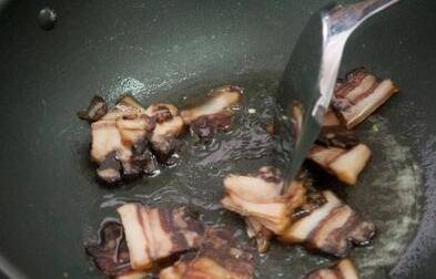 3、腊肉煸炒致肥肉半透明时倒入春菜煸炒,并放入适量白糖。