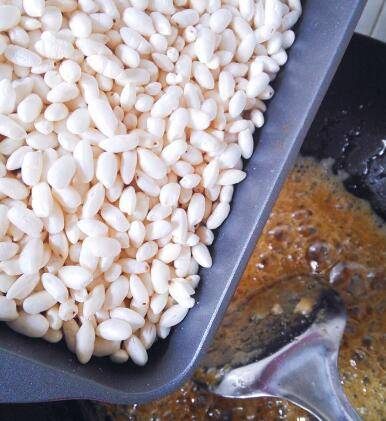 把4大勺米花倒进去,趁热迅速搅拌均匀。