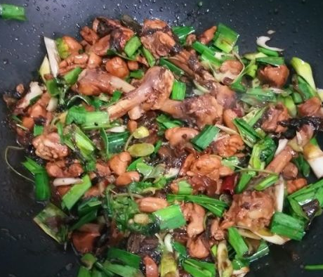 转大火收干汤汁,再加入青蒜大火翻炒,最后调入少许的盐和鸡精翻炒均匀,出锅装盘。