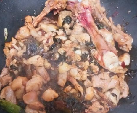 倒入鸡肉,鸡骨一起大火翻炒,炒到鸡肉发白,再调入适量的料酒、老抽翻炒均匀;