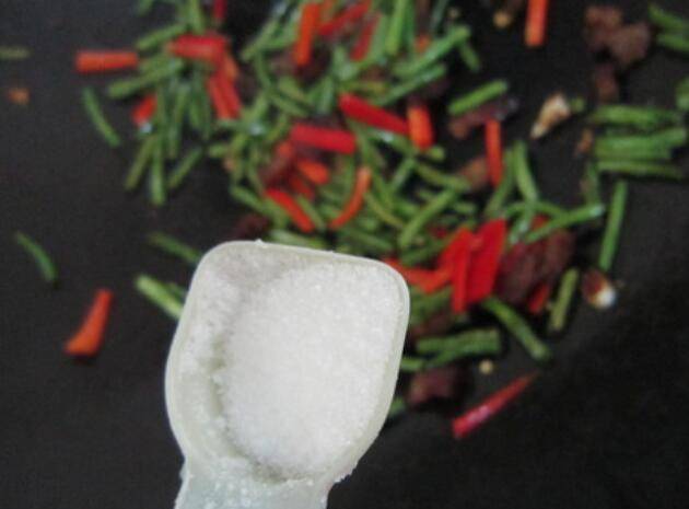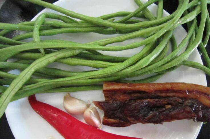 用料:豇豆200克、腊肉100克、红尖椒1个、植物油2汤匙、食盐2克、生抽1茶匙、蒜2瓣。