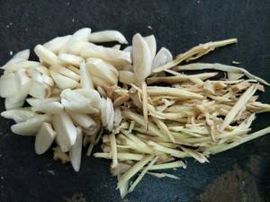 4、把姜、蒜放到锅子一边。下魔芋豆腐加盐炒一会。