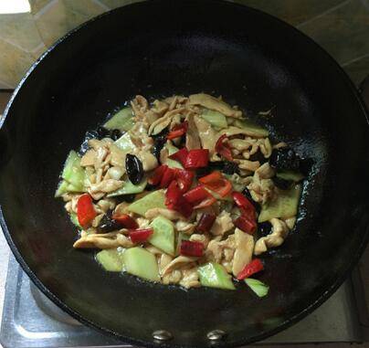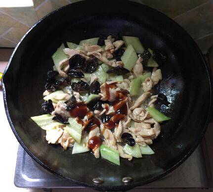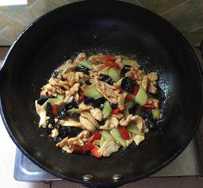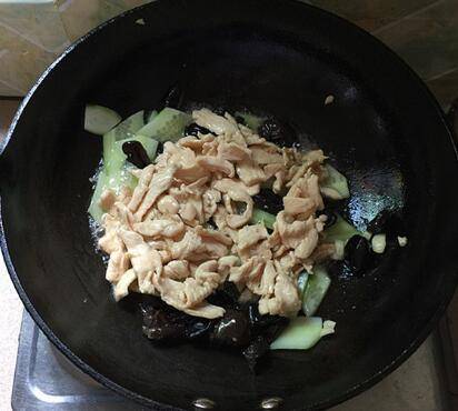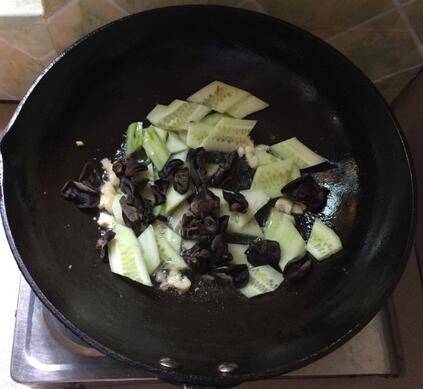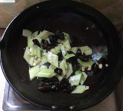 煸香后下黄瓜片和黑木耳。