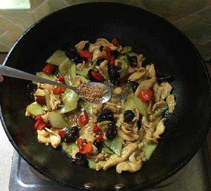 炒匀后淋入蚝油。