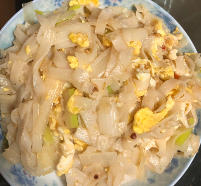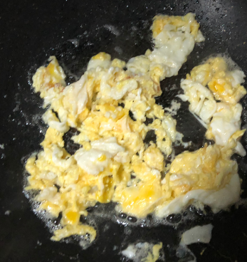 热锅下油,打入两个鸡蛋,不要炒太碎,把面从盆里捞出丢进锅里。