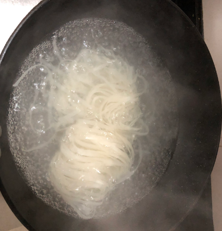 鸡蛋2个、面条两团。起锅烧水,水开后把干面丢进锅里盖上锅盖煮两分钟左右。