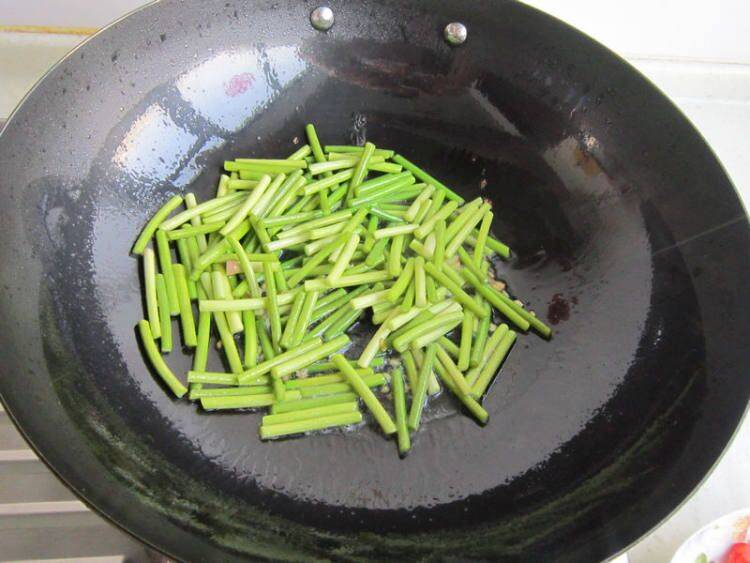 2、把蒜薹去头尾洗净切段,加少许盐拌均匀,腌制入味。