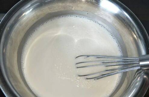 缓缓的,倒入之前搅拌好的牛奶玉米淀粉。一边倒一边搅拌,不要停。