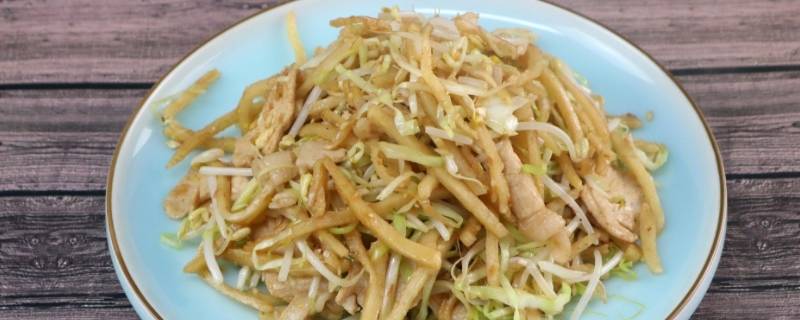 用料:饼丝500克、洋葱1个、胡萝卜半个、青椒半个、绿豆芽200克、盐适量、葱蒜适量、生抽2勺、食用油适量。