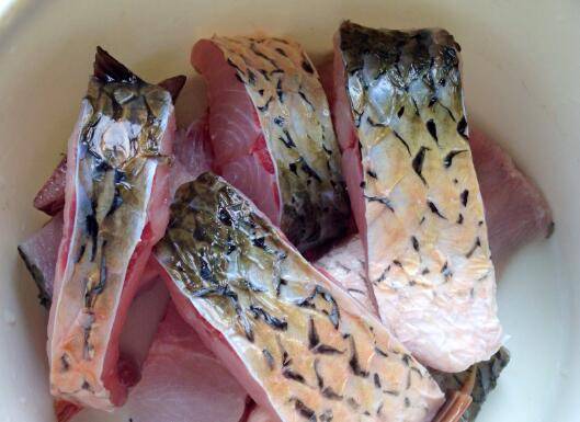 用料:草鱼块650g、油300g2、酱料汁、花雕3大勺、湖羊酱油3大勺、糖1大勺、五香粉1小勺、大茴香(八角)1个、干辣椒4个、姜片3片、葱1根、清水、米醋1勺。