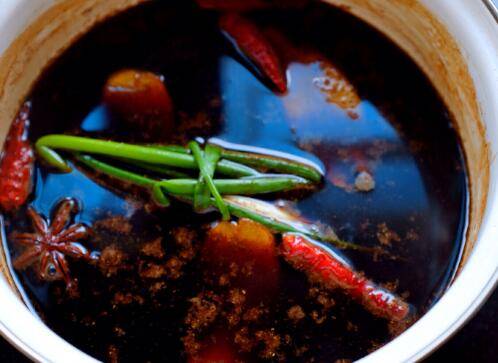 1、酱料汁加入清水加入生姜片煮开,在放入干辣椒和葱结煮一下,放凉后,去掉姜片辣椒和葱结。