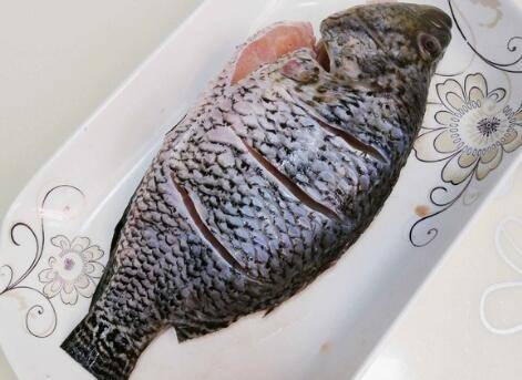 准备食材:花斑鱼一条、大蒜适量、蒸鱼酱油适量、盐适量。